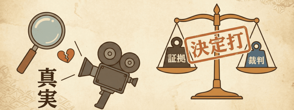 | ③ 反省の態度 (悪質性) | 【証拠:なし・不十分】 決定打がないため、相手が「誤解だ」とシラを切り続ける。裁判が長引き、疲弊して**低い金額で妥協(和解)せざるを得なくなる。 | 【証拠:言い逃れ不可】 明白な証拠があるのに嘘をついていたことが露呈。「不誠実な対応」として裁判官の心証が悪化し、判決・和解交渉ともに有利に進む。 |