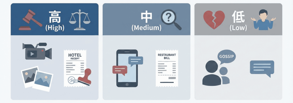 証拠には「これ一つで勝てる」という強力なものから、「組み合わせることで力を発揮する」ものまで様々です。証拠価値(証明力の強さ)で分類して解説します。