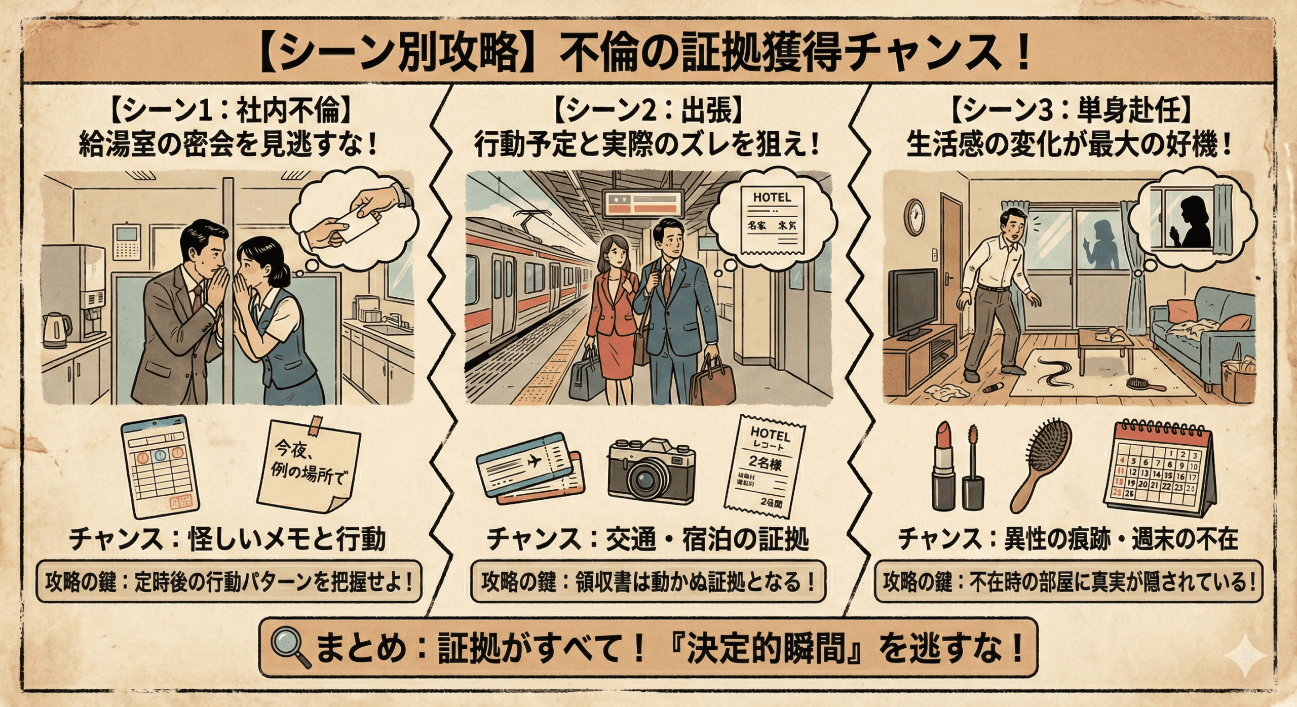 毎日顔を合わせる「社内不倫」と、物理的距離がある「単身赴任」では、証拠を掴むチャンスも、狙うべき瞬間も異なります。