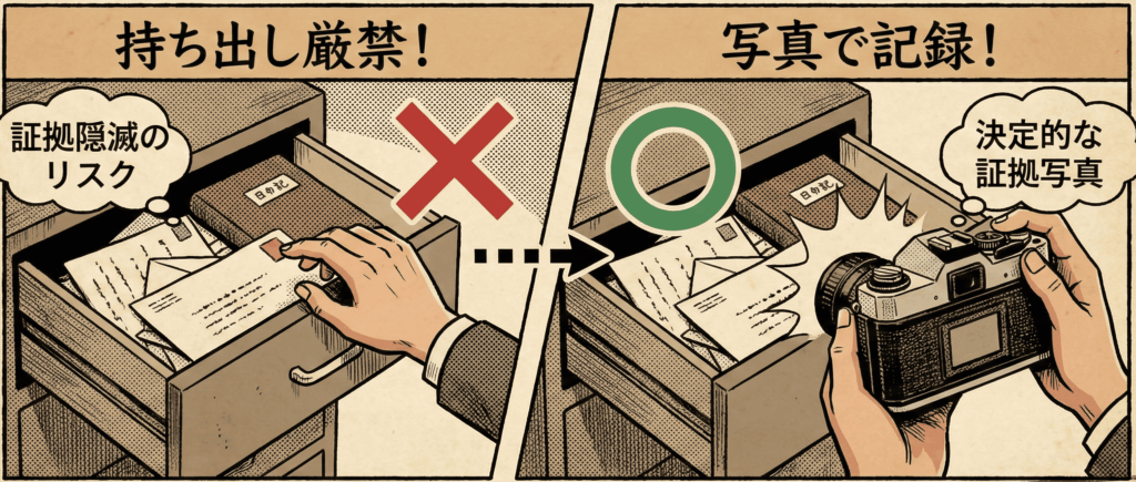 | 対象の証拠品 | 【NG】現物を持ち出す(没収・廃棄)→ 調査失敗・逆ギレのリスク | 【OK】撮影して完全に戻す(現状維持)→ 調査継続・言い逃れ封じ |